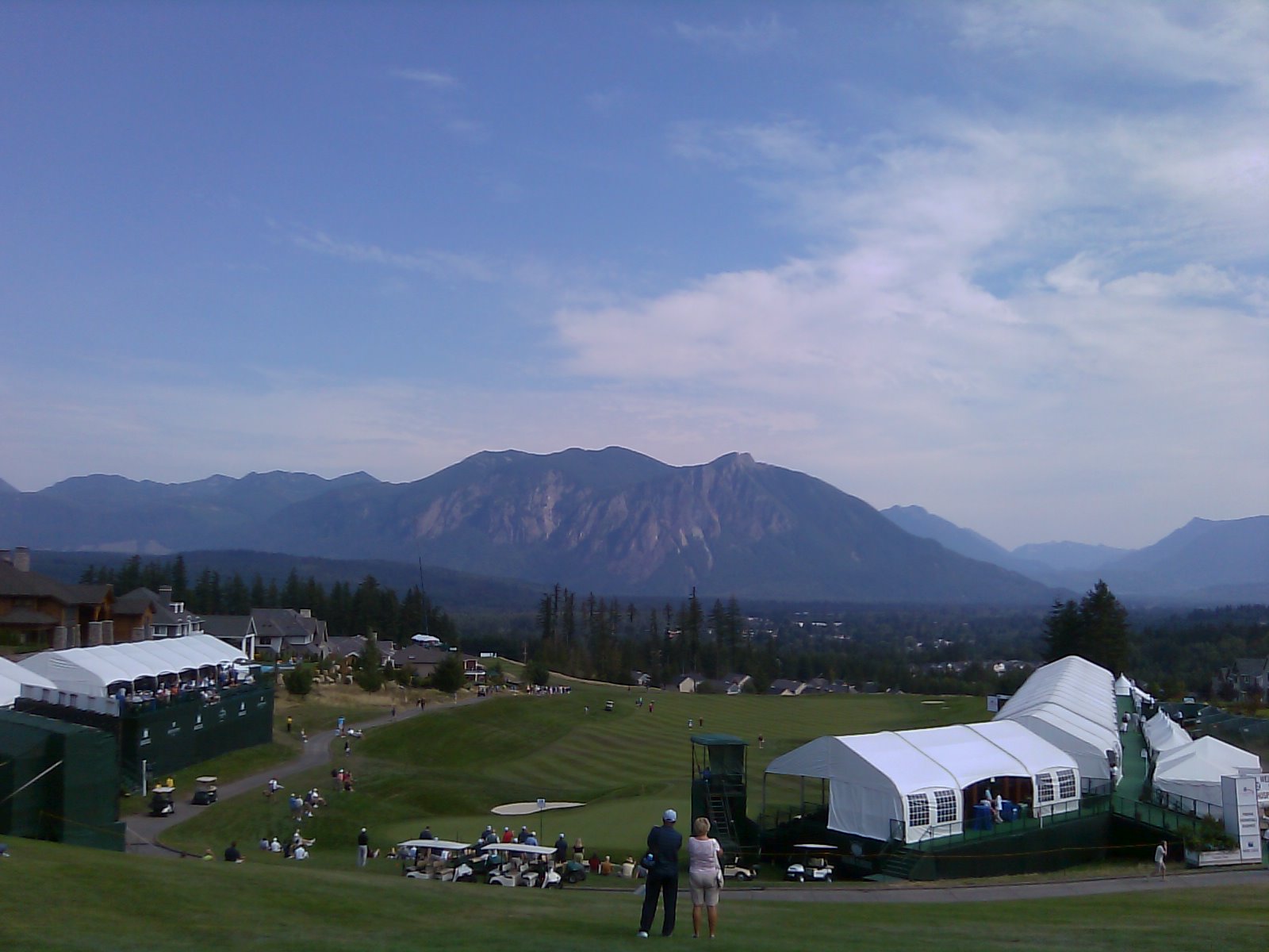 This has turned out to be one of my favorite days of the Summer: taking the day off from work and watching the senior PGA golfers during the opening round of the Boeing Golf Classic. I get up early enough to play eighteen holes myself then spruce up and head to the TPC Snoqualmie Ridge course. Once there, I watch the pros warm up, have a hot dog for lunch and then follow some of my favorite players around the course for the afternoon. Finally, I’m always impressed that many of these guys go right from the final hole back to the practice range. They are just so remarkably good. And what a glorious setting: is this a fantastic finishing hole or what?