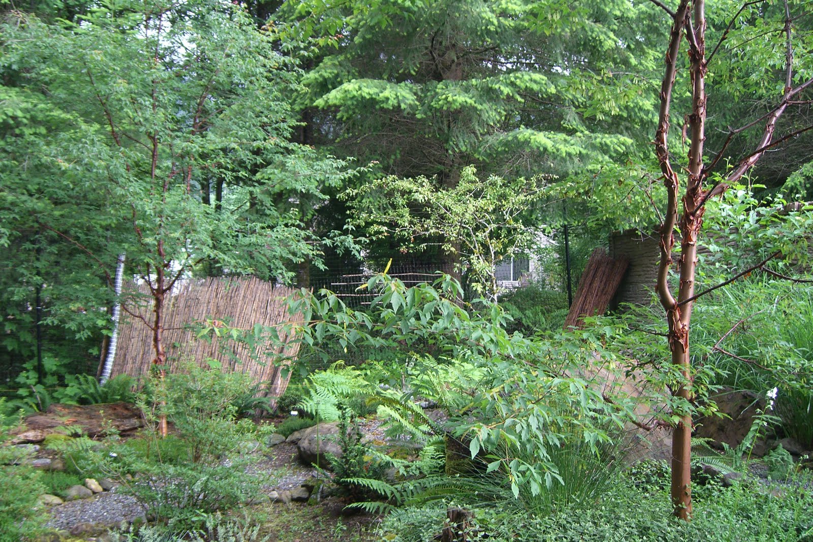 fencing. Now we’ve finally completed the additional 120 feet of fencing to the north east lot corner. Gone are the mangled black filament, logs, sheets of bamboo and metal posts bent by the bear break-in last fall.