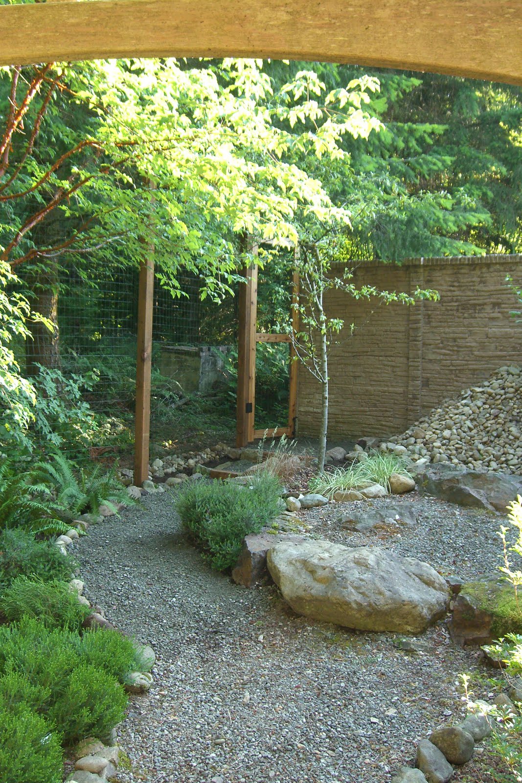 Now we have a consistent run of green metal fencing strung on eight-foot high 4×4 posts each set in 120-pounds of concrete. And a gravel path leads to a nice cedar gate opening to the neighbor’s lot, a cedar bench and bird bath. It’s a great place for a morning cup of coffee or to watch the sun set on Mailbox Peak to the east.