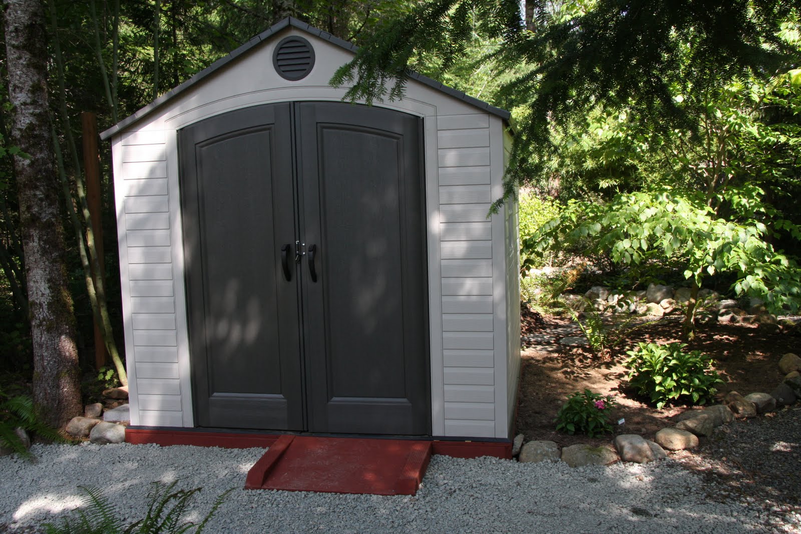 The latest addition to our 2010 landscaping projects is complete: a garden shed. We purchased a pre-fabricated resin structure from Costco and managed to clear the area (four trees and stumps), build the wood foundation and put it all together is just a little over a week. It’s an 8 by 7.5 feet building that looks nice in our wooded setting and keeps our garden tools out of the garage and near where we use them.