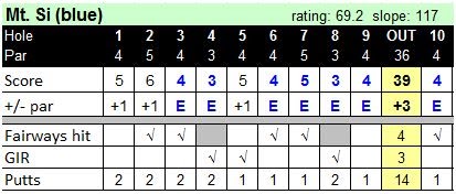 Three days after my pathetic performance at Gold Mountain, I shot an eight-over-par 80 at Mt. Si. It was a superbly steady round with 11 pars and just one double bogey. I’ve only shot better than 80 twice: a 78 in June 2007 and a 79 in October of 2009.