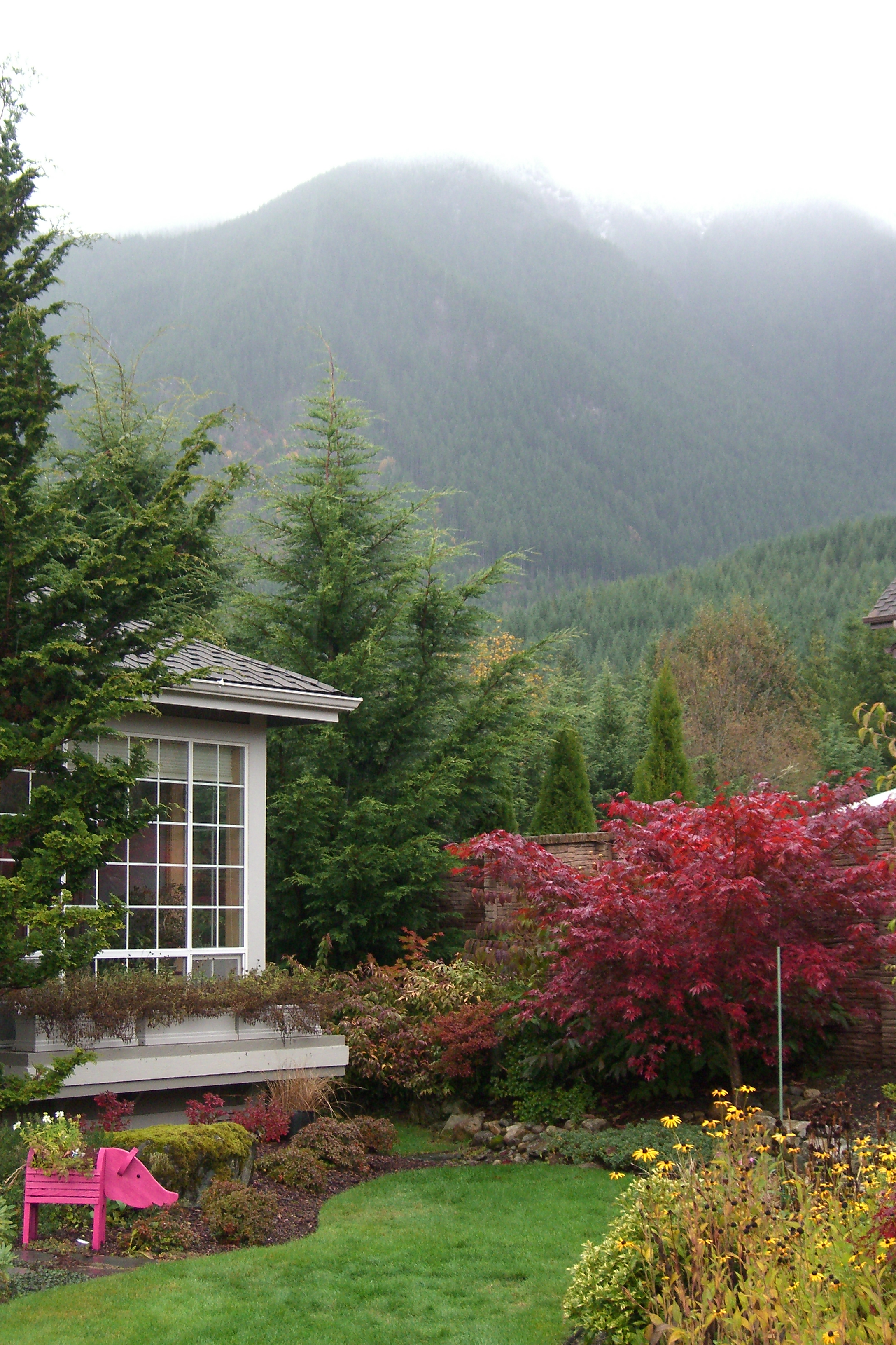 We’re having our first prolonged fall rainstorm: steady rain and drizzle since Friday night. And behind the mist atop Mt. Si I got a glimpse of the first visible snow of the season. Many of our trees, like the little maple here, still have most of their leaves on them so the yard has lovely fall colors. But that won’t last much longer.