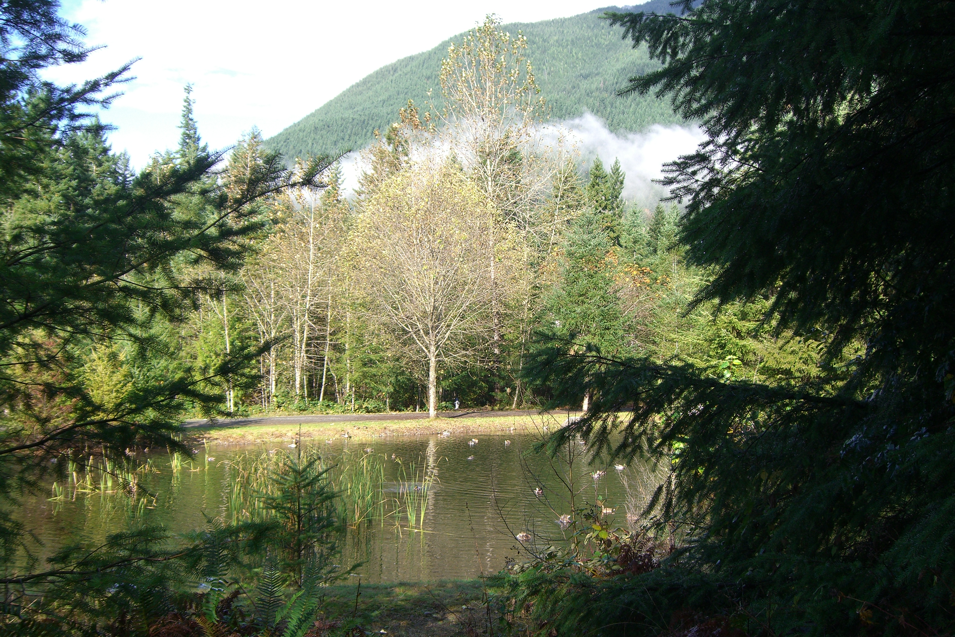 Trisha’s ducks come to feed every morning a few minutes after sunrise then they spend the rest of the day in the little pond at the north-west corner of our lot. This afternoon I heard a lot of splashing sounds and decided to take a look. The little quackers were flapping wings, dunking themselves and darting about like crazy apparently taking advantage of the sun and calm conditions to take a collective bath. It was a lovely sight.