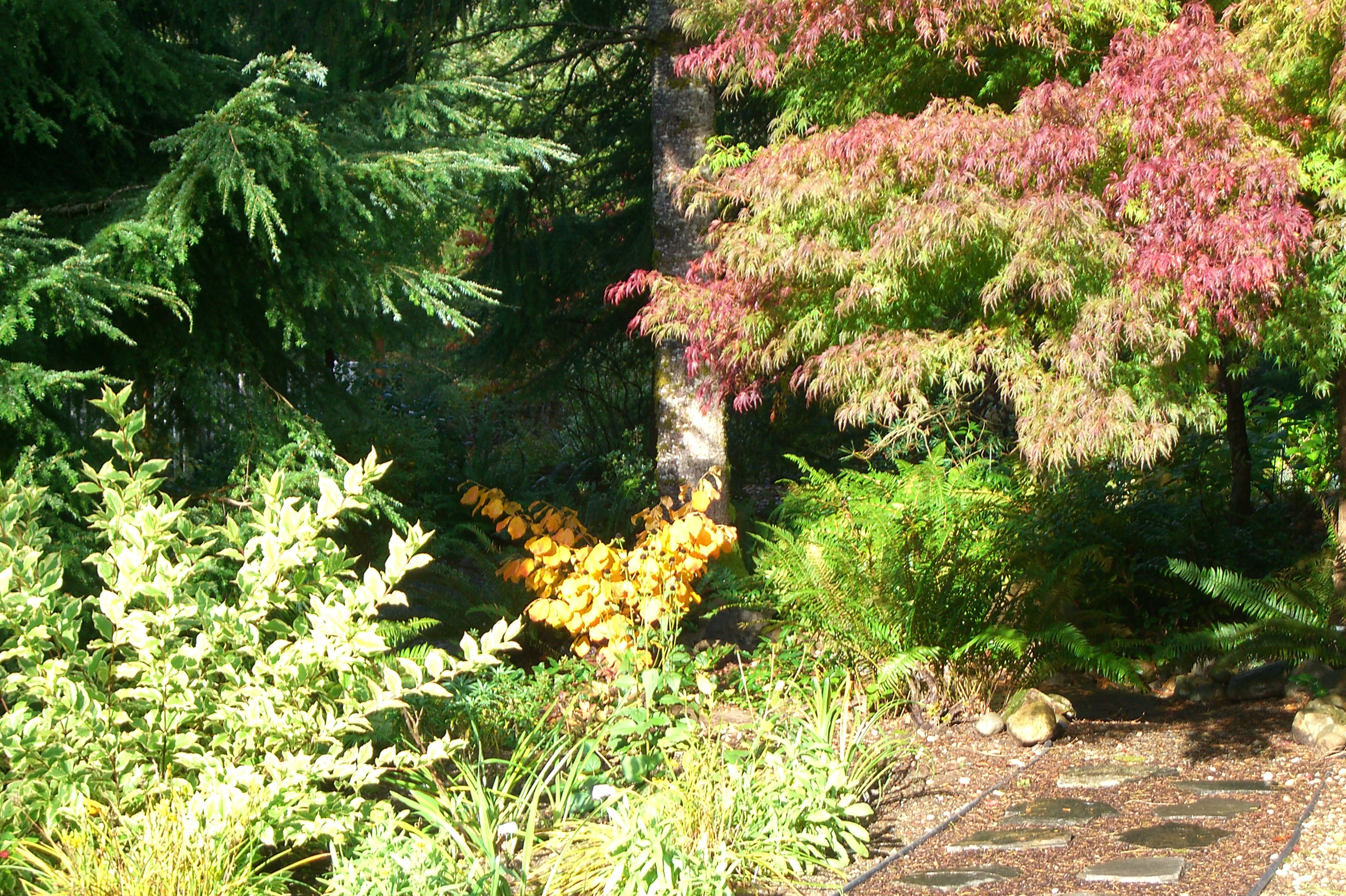 This little guy is changing colors quickly and I doubt he’ll keep his leaves much longer so I got a photo today before the next windy day leaves just naked branches. In the forefront at top left you can see a bit of the red berries from the Hawthorne and to the right some of the Paperbark Maple. The low shrubs in front of the Coral Bark are varieties of variegated dogwood.