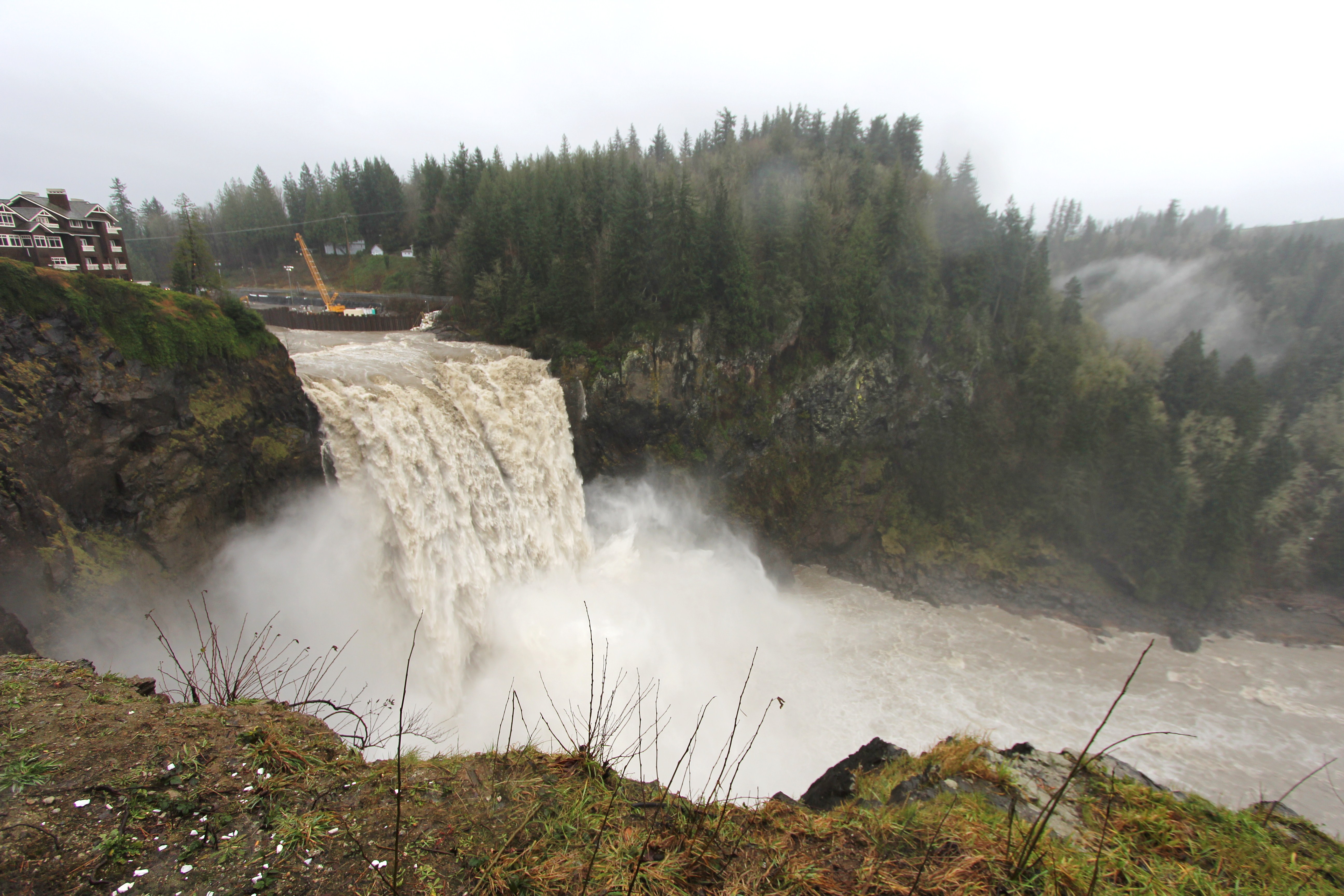 We had the big pre-Thanksgiving record snowfall and frigid temperatures; now the thermometer is in the mid 50s and we’ve had a record two-day rainfall. Over 4 inches at the airport and almost that much here in the foothills. Trisha and I made a quick visit to Snoqualmie Falls to get a glimpse of the fabulous cataract. It’s always impressive but after this much rain the Falls are really thrilling to see.