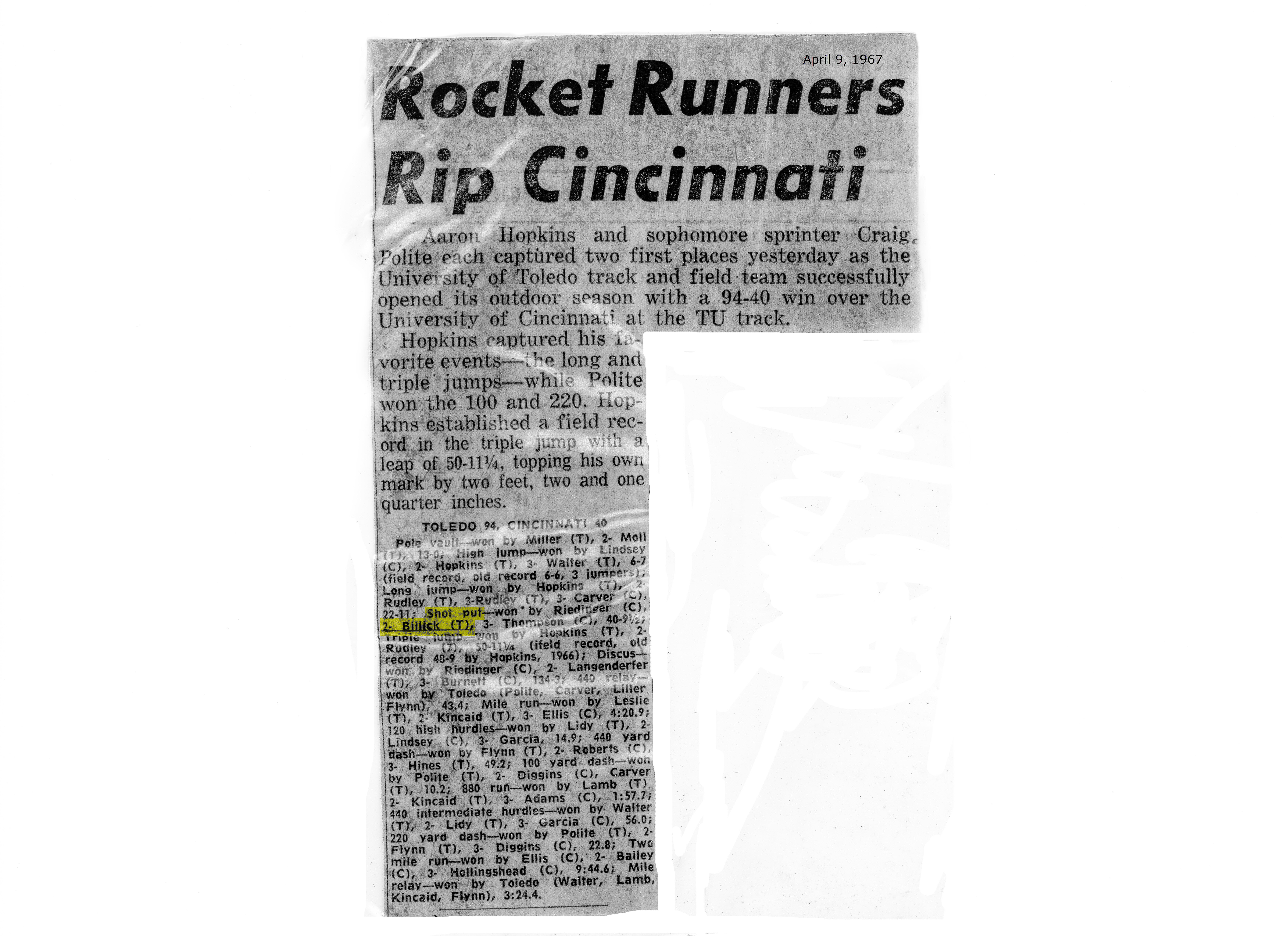Second place in shot put, Toledo v. Cincinnati; not bad for a 5′ 8″, 180-lb sophomore (click image to enlarge).