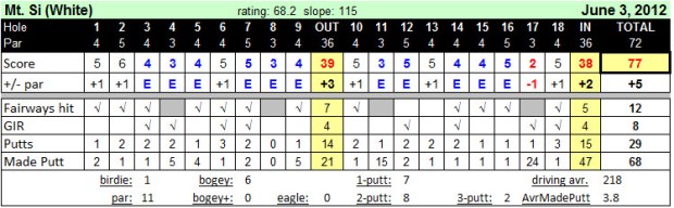 The 77 is my second lowest score ever and the first time I’ve been in the 30s on both nines in the same round.