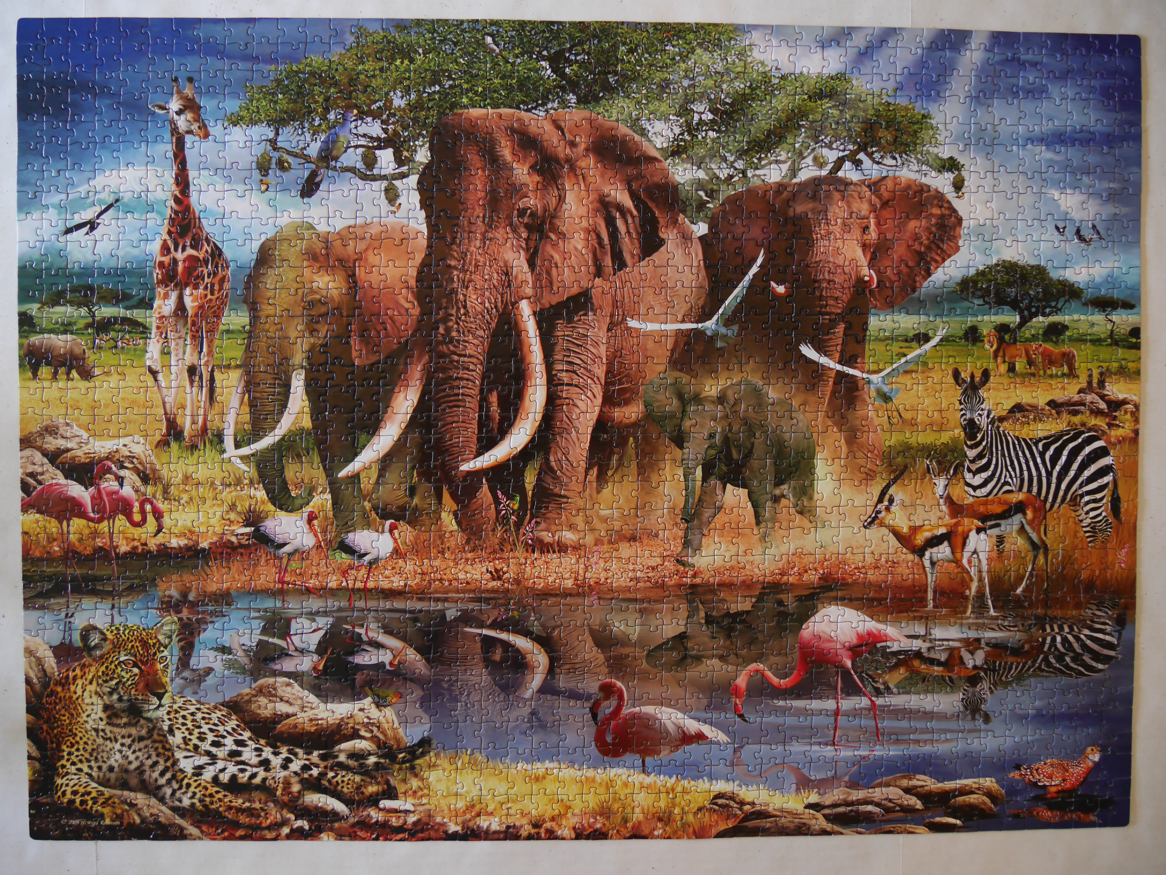 Our latest “creation” was a challenging but satisfying one. The reflections in the water were especially difficult. But you gotta love the pink flamingos, zebra and baby elephant.