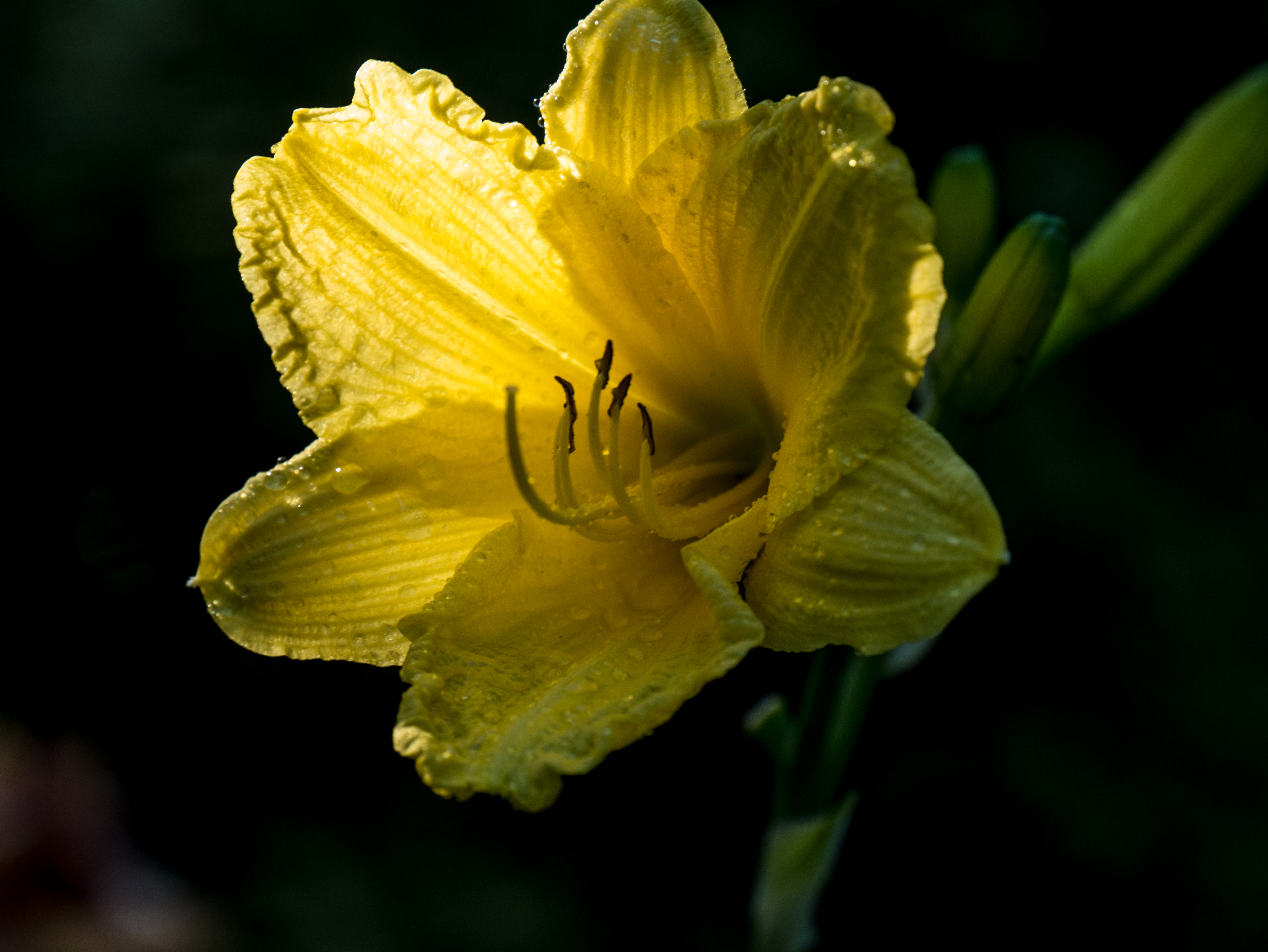 Trisha has quite a collection of day lilies. This small yellow one just caught some of the rays of the setting sun to show off before night fall.