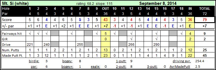These good rounds always seem to sneak up on me. I was just hoping to have a reasonable round with not too many poor shots. Started by missing a 4 foot putt on the first hole for a bogey, followed by bogeys on holes 2,4 and 6 plus a double on number 5. Not exactly an encouraging start. But three birdies yielded an even par 36 on the back nine for a final score of 79 even with three missed putts inside five feet.