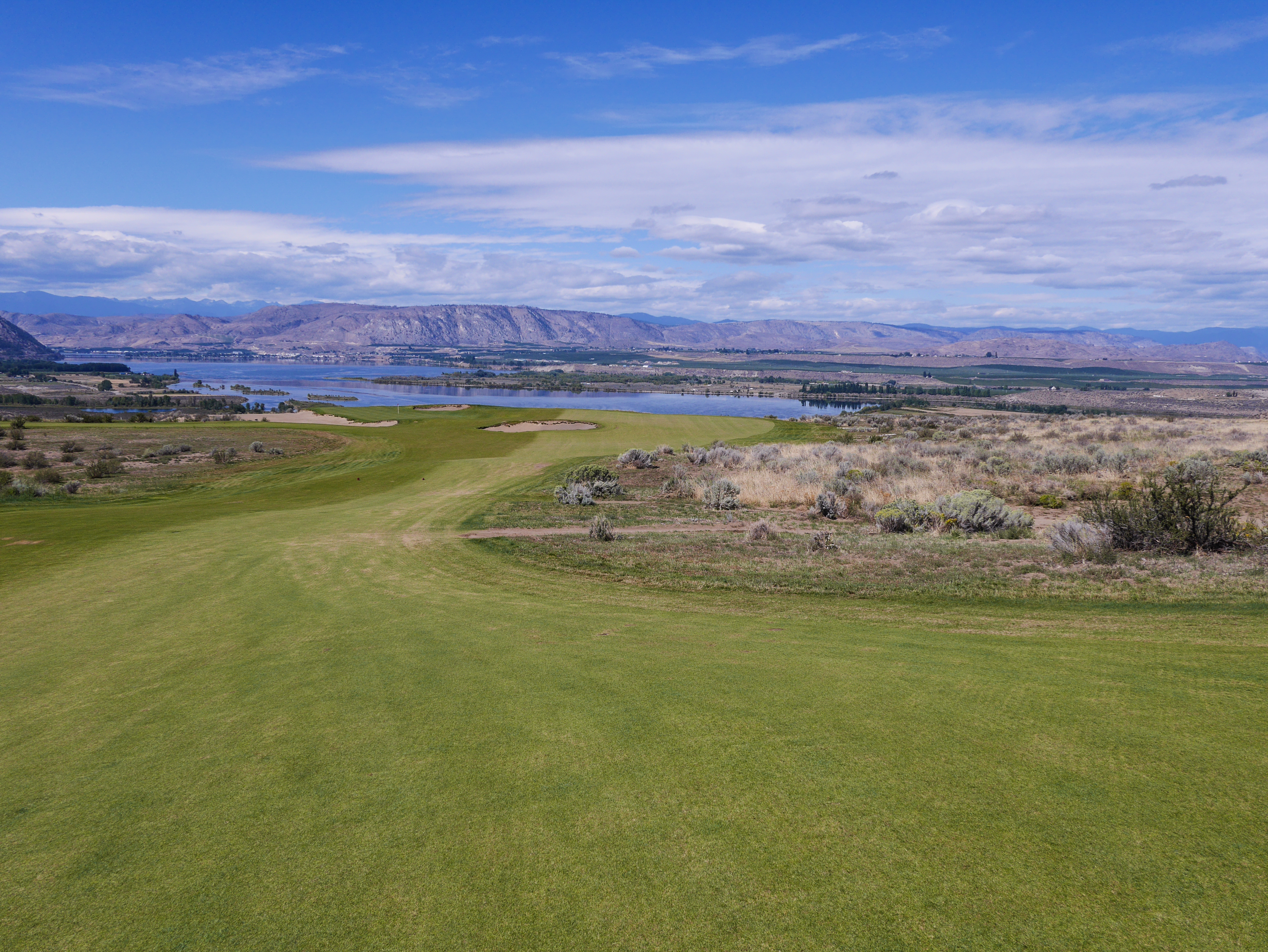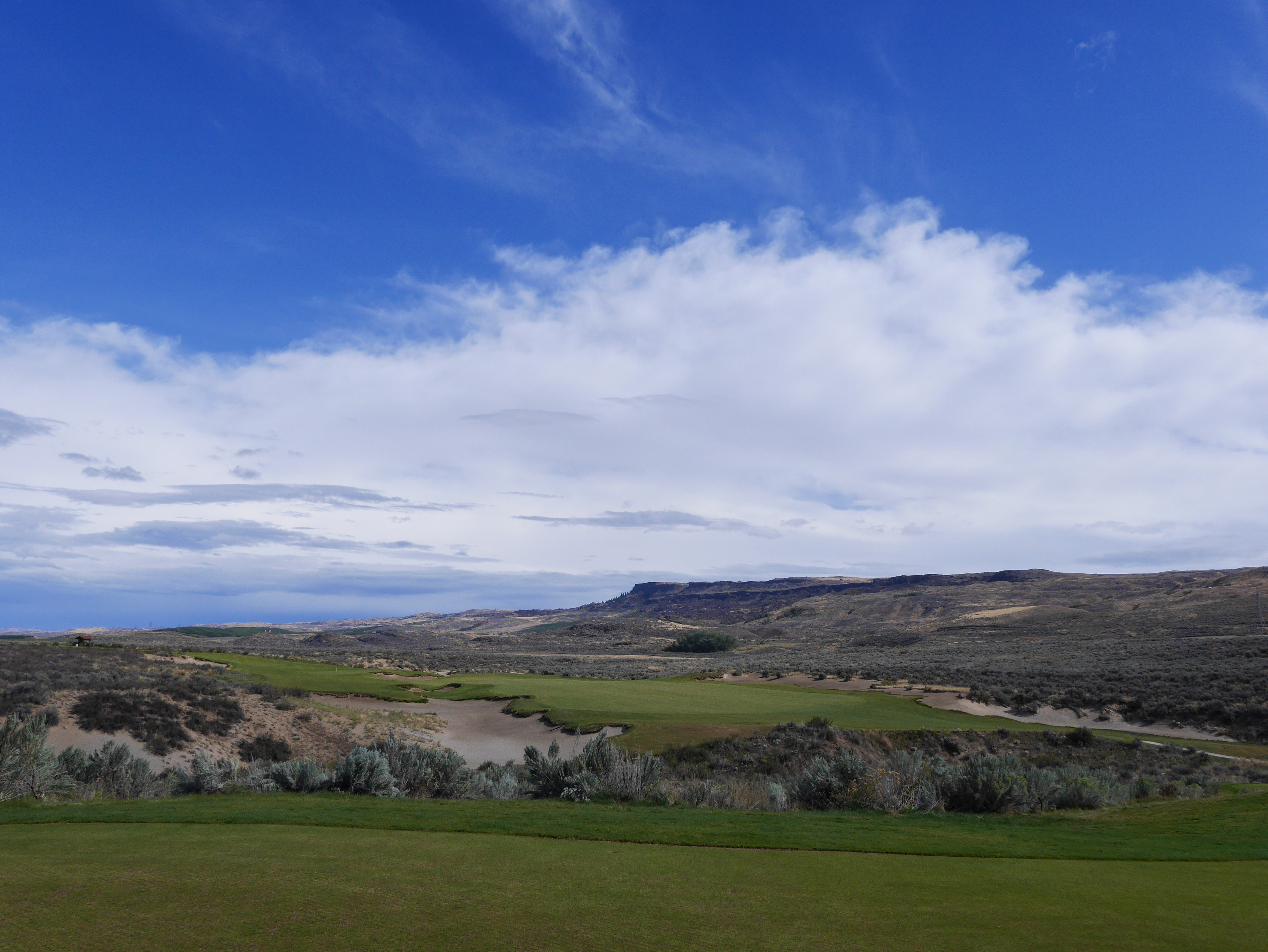 There’s been a ton of hoopla about the new links course north of Chelan designed by David MacLay Kidd, the same architect who did Bandon Dunes in Oregon. I thought this might me a quiet week to see for the course for myself so I set out this morning and teed off at Gamble Sands around 11:30. What a treat! It’s a true links course, just missing the salt water air. Rolling fairways, lots of fairway and greenside bunkers, huge multi-level greens and none of that deep grass rough… just sand and scruffy natural grasses and shrubs. With all the slopes and bunkers every shot is a little puzzle. The 2nd hole, pictured above, is a perfect example. It’s just a 260-yard par 4 but the green is well guarded by bunkers so you have to choose a layup past, short of or right of the big fairway bunker in the middle.