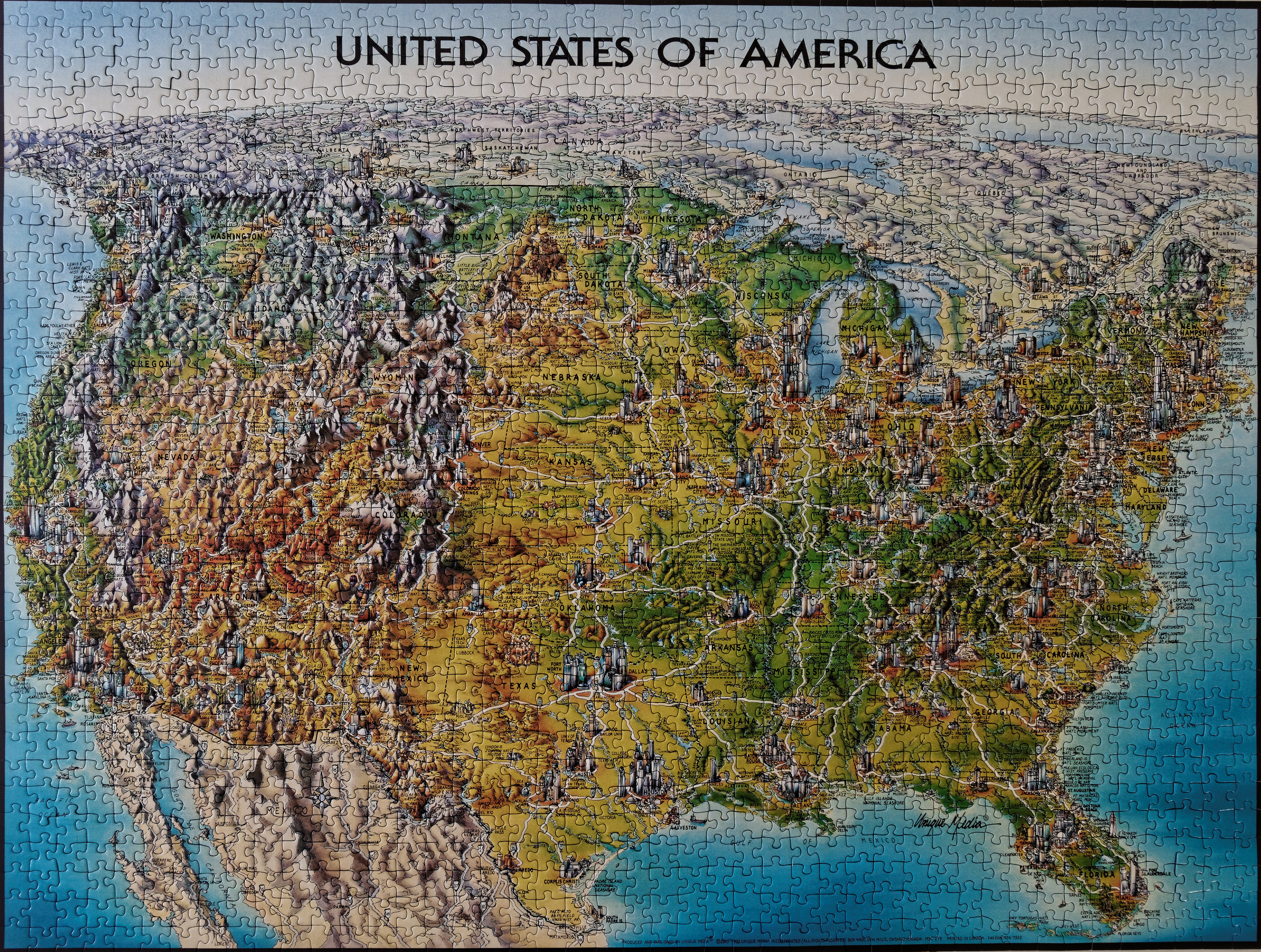 We enjoyed this one immensely. It was great fun identifying the places we have visited and lived, and admitting how little we know about the geography of the eastern half of the U.S. This puzzle also added little false leads by including duplicates of well-know place names Charleston, SC and Charleston, WV. Very sneaky. At 1500 pieces it kept us busy for two weeks.