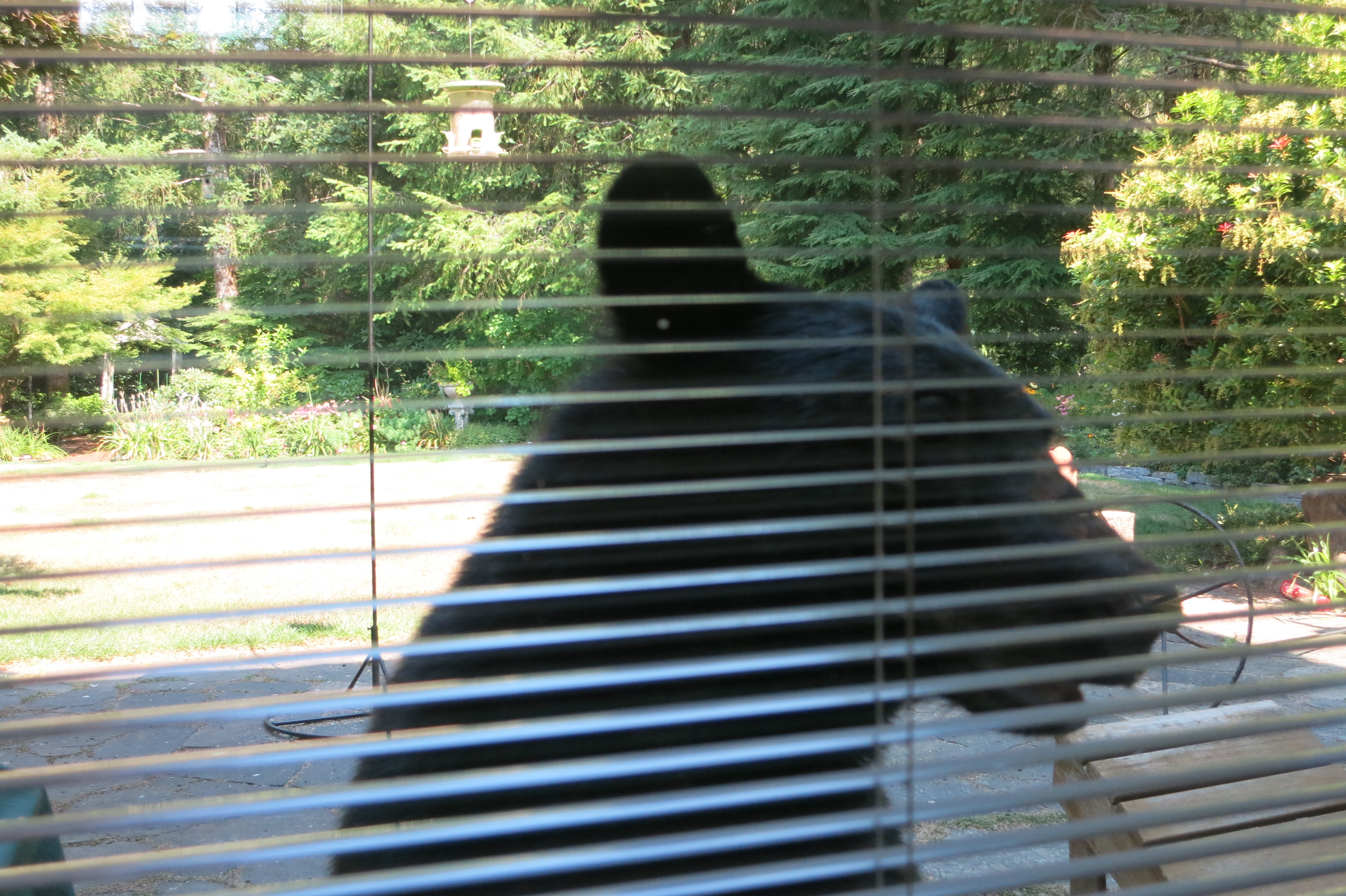 We had bear incursions Monday andTuesday nights and again around 4:00 a.m. this morning. What a shock, however, to see this largish black bear on our patio just a few minutes ago. Worse, he seems totally fearless. First, I pounded on the windows… to no effect. In fact, he approached the sliding door and looked right at me through the glass. I had fortunately closed the screen portion only thirty minutes ago. He backed off, snatched one of the bird feeders and started to chow down. I banged pots together and shouted at him. No effect. I threw my shoes at him. Unimpressed. Finally, I beaned him with a rock and he ambled away, through the portion of our fence that he tore down to get in.
